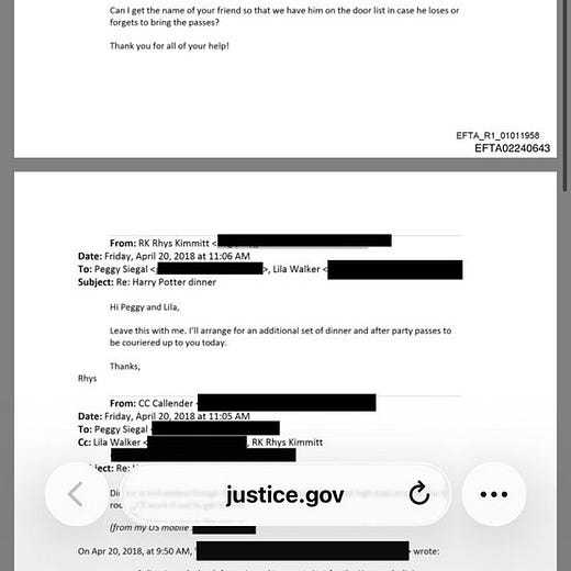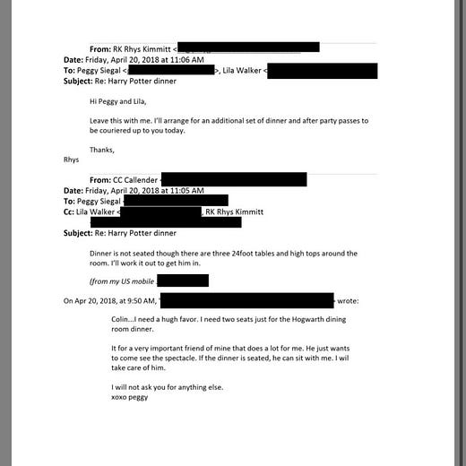 Siegal appears to have called in a favour to secure additional seats for the dinner without flagging Epstein’s name to Callender directly. Epstein’s name was communicated to Callender’s assistant, Rhys Kimmitt, who handled ticketing logistics.
