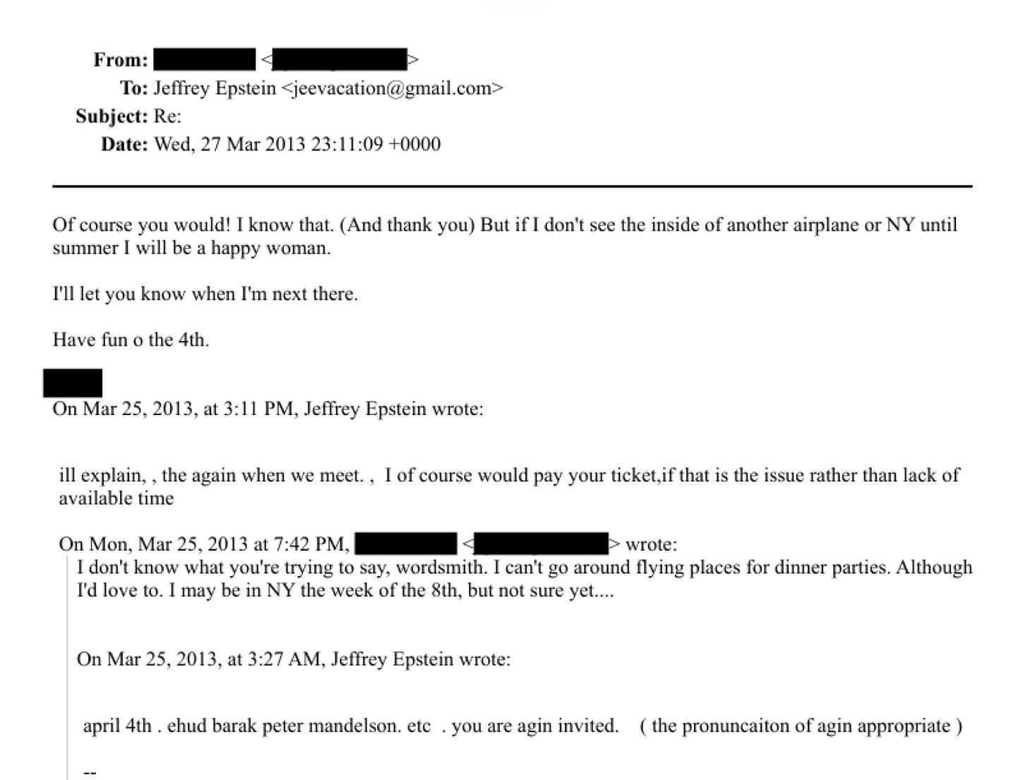 In a Monday follow-up email after the premiere, Siegal indicates that only one dinner ticket was supplied, that Epstein’s name was not on the guest list, and that he was turned away at the door.