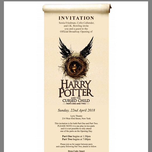 The oft-shared PDF invitation to The Cursed Child’s New York premiere, the intermission supper, and the after-party was, on the available evidence, sent to entertainment publicist Peggy Siegal.